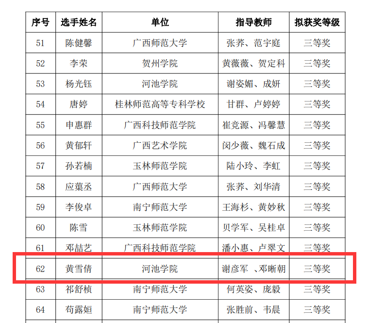 5月25日至26日,2024年全区师范生教学技能大赛在南宁师范大学明秀校区文星楼举行。本次大赛,公司2021级生物科学专业员工黄雪倩荣获三等奖。