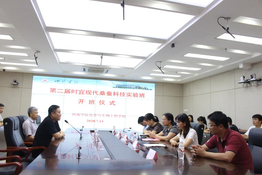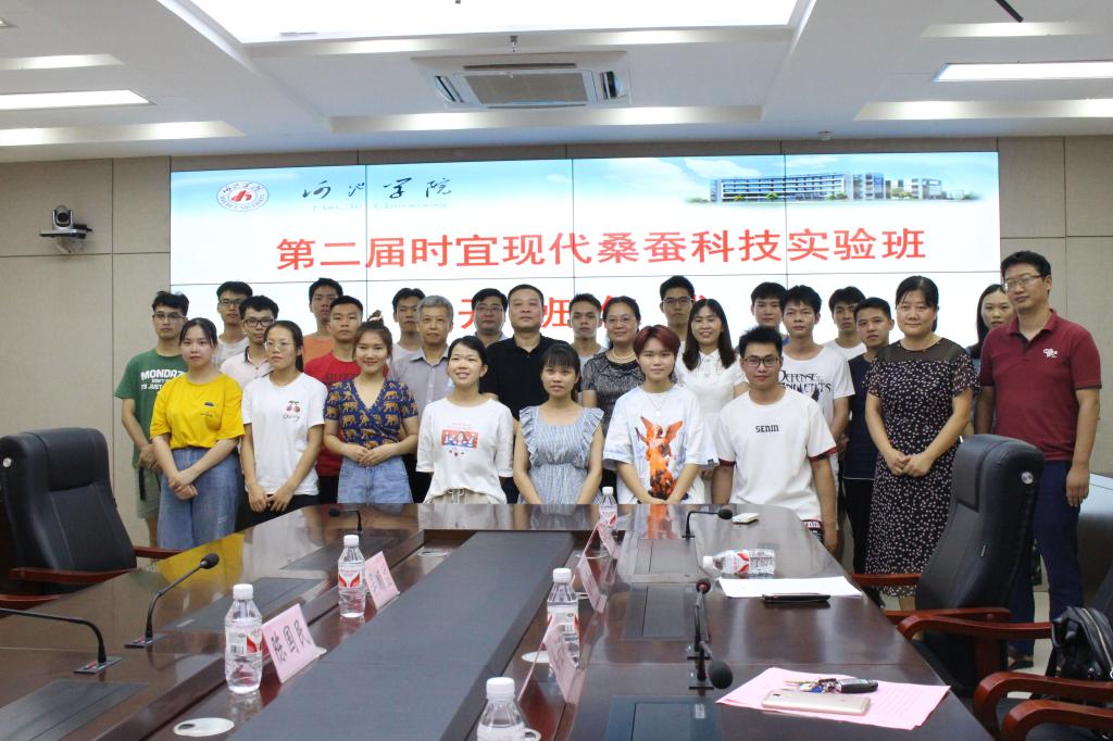 7月24日下午,公司与时宜科技农业有限公司第二届时宜现代桑蚕科技实验班开班仪式在格致楼907教室举行。广西时宜董事长陈国民,公司党委副书记韦仕珍,化生院经理黄秀香,副经理高丽霞、李启虔,部分教师代表以及实验班学员参加开班仪式。
