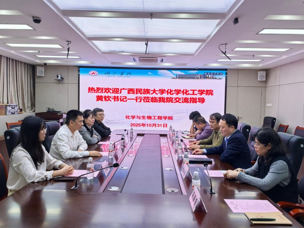覃宝山对黄钦一行的到访表示热烈欢迎。随后,李晓东从公司发展历程、团队队伍构成、学科专业设置以及科研平台搭建等方面介绍了公司发展建设情况。黄钦介绍了广西民族大学化学化工公司的基本情况。双方围绕科研平台建设、科研项目合作,以及桑蚕产业、医用材料、有色金属、林产化工等地方特色产业的研发需求与科研创新方向,展开了深入交流。