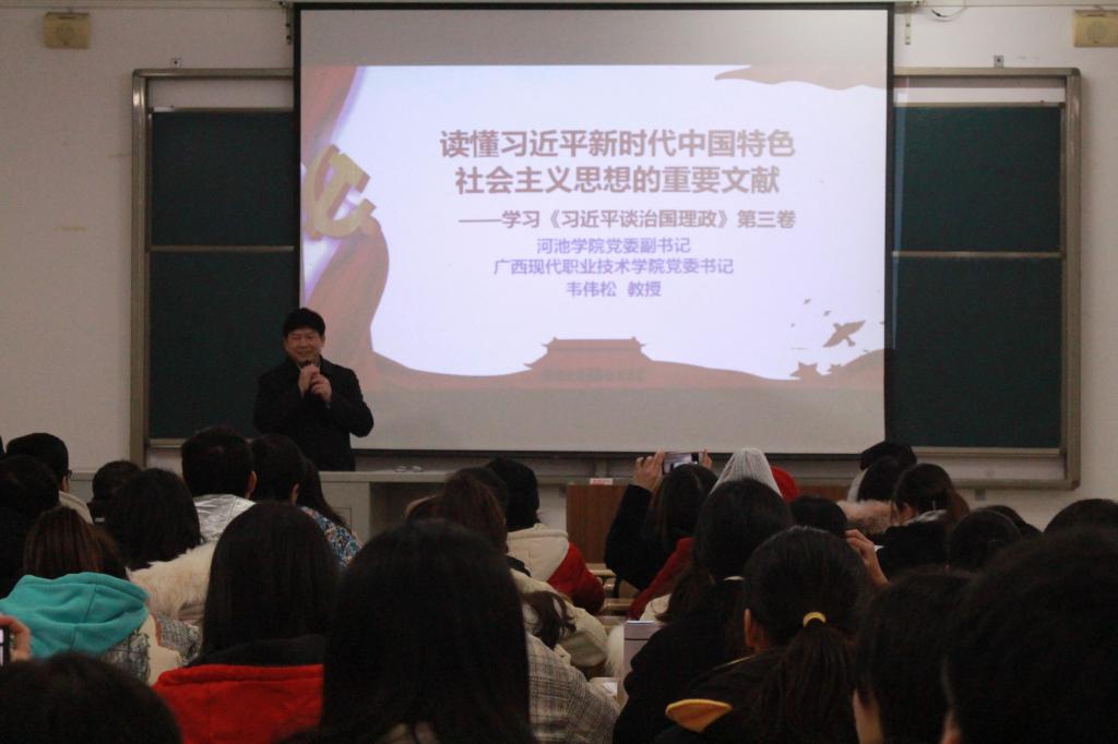 为了深入学习贯彻习近平新时代中国特色社会主义思想,进一步学懂弄通悟透《习近平谈治国理政》第三卷的重要论述精神, 12月15日晚,化生公司在格致楼101教室召开《习近平谈治国理政》第三卷宣讲会。宣讲会由河池公司党委副书记韦伟松主讲,化生公司全体教职工及员工党员参加宣讲会,会议由化生公司党委书记覃勇荣主持。