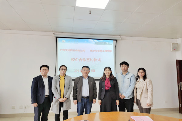 4月25日上午,化生公司与广西天铭药业有限公司在西区格致楼823室举行产学研合作签约仪式。出席签约仪式的有天铭药业总经理刘鹏以及化生公司经理黄秀香等。