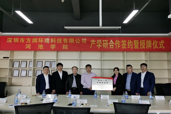 深圳市方润环境科技有限公司董事长张刚、董事史彦龙总经理、董事潘艺林总经理等对我方到来表示热烈欢迎,董事长张刚就企业目前的基本情况和主要业务作了详细介绍,并对公司培养的毕业生的综合能力表示高度的认可,他指出校企合作是双方未来发展的重要方向。黄秀香经理表示校企双方可在人才培养、实习实践、共建实验室、工业废水处理等方面更深入的探讨,并对方润公司在公司设立的奖学金表示感谢,该项奖学金本着“”不断推进校企合作工作。随后,“产学研合作签约暨揭牌仪式“在方润会议室成功举行。双方人员共同参加了此次揭牌仪式。