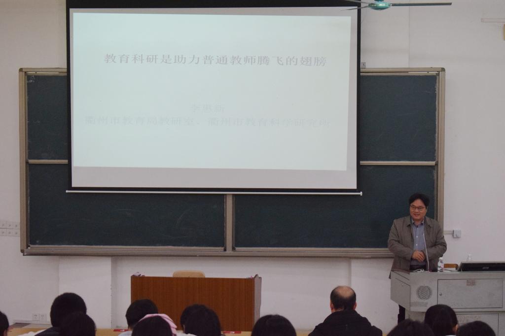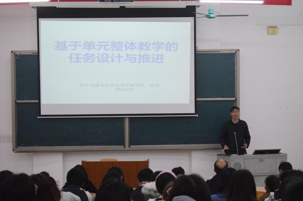 李惠新以“教育科研是助力教师腾飞的翅膀”为题,从卓越教师成长、教育科研、论文的撰写等方面进行阐述。林伟以“基于单元整体教学任务的设计和推进”为题,紧扣生物学新课标,围绕当前单元教学存在的问题、概念界定、操作策略、具体教学案例等方面进行讲解。