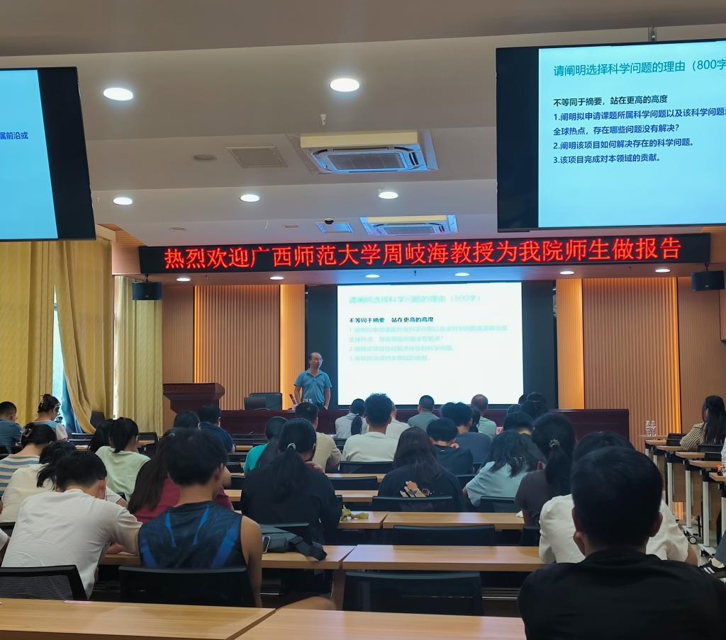 会上,周岐海教授针对国家自然科学基金申报项目介绍其相关经验,分别就国家自然科学基金的内容、基金申报前的准备、撰写申请书、项目申报注意事项这四个部分进行详细介绍。周教授指出,科研项目竞争激烈,国家自然科学基金评估项目应重在突破创新思维,侧重于基础理论和方法,选题要紧追科学部资源领域,凝聚科学问题。
