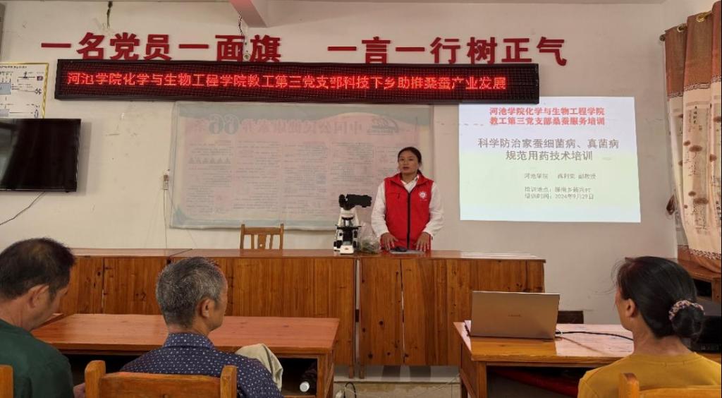 教工第三党支部与新兴村村委会班子成员及村民代表召开座谈会,第一驻村书记介绍本村的基本情况及主要支柱产业,让老师们了解当地的发展需求,进一步探讨合作方案,建立长效帮扶机制。通过实地考察桑树、中草药天冬等种植地,了解其种植规模、生长状况和经济创收等情况,收集村民在桑树种植、中草药种植技术上遇到的急切问题,给予技术指导和建议。william威廉亚洲广西科技特派员覃玥与蒋利荣分别就桑园管理及养蚕准备、科学防治家蚕细菌病规范用药指导桑园管理进行主题培训,为村民传授科学的管理方案。