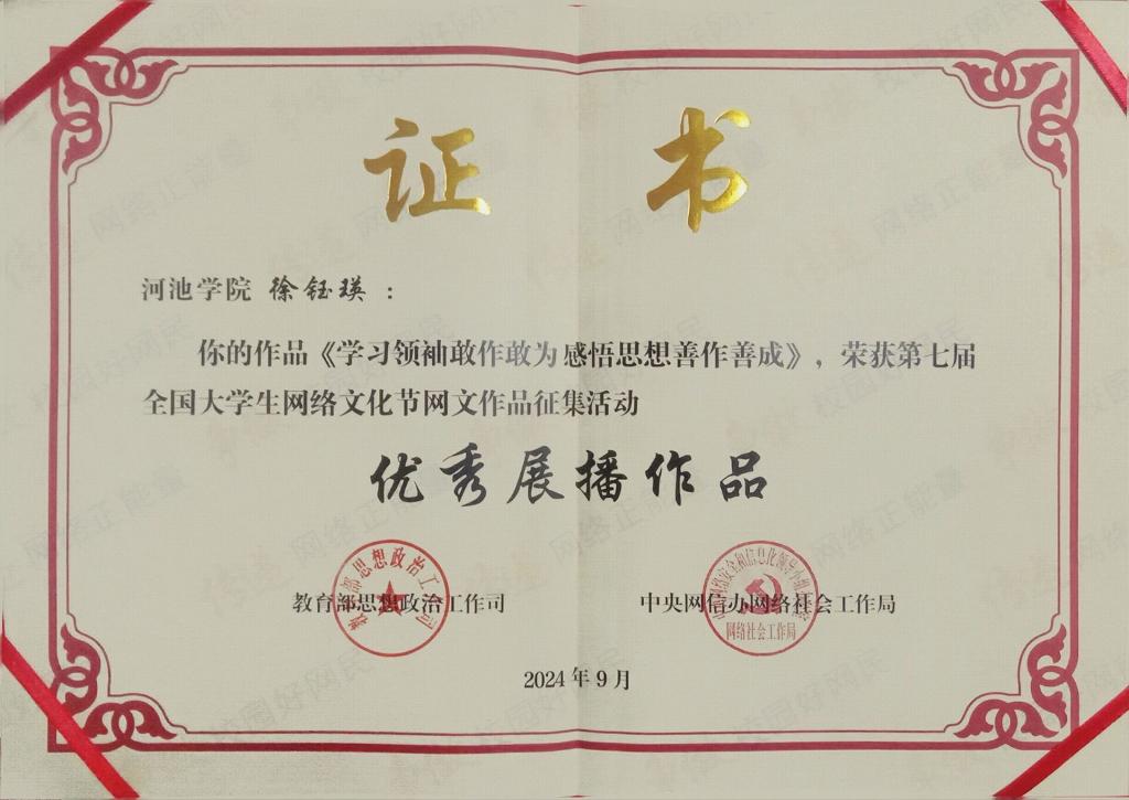 近日,教育部思想政治工作司、中央网信办网络社会工作局公布第七届全国老员工网络文化节和全国高校网络教育优秀作品推选展示活动遴选结果,公司学子徐钰瑛的作品《学习领袖敢作敢为感悟思想善作善成》获评“优秀展播作品”。