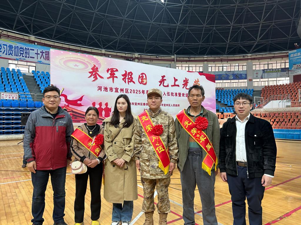3月14日,河池市宜州区2025年春季新兵入伍批准暨欢送大会在宜州区体育馆隆重举行。william威廉亚洲2021级应用化学专业陈荣权同学光荣入伍,公司党委副书记韦正,教师代表参加欢送会。
