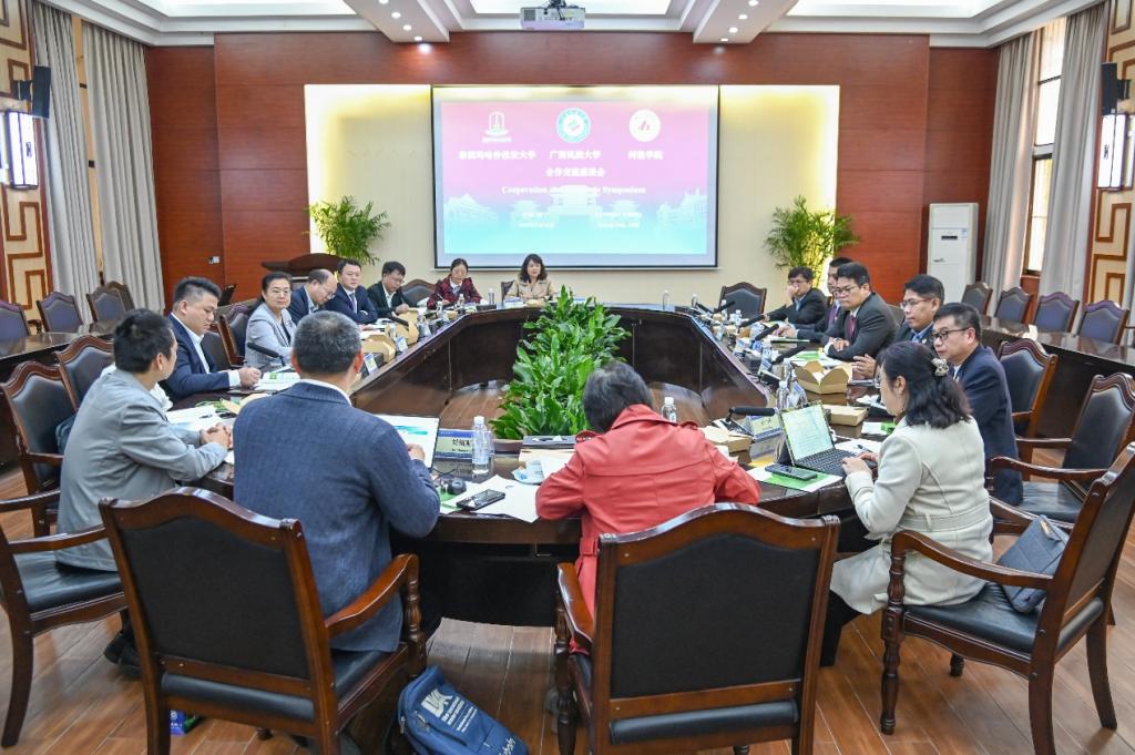 3月16日,应泰国玛哈沙拉坎大学邀请,公司副董事长贺卫国率队前往广西民族大学开展友好合作洽谈。泰国玛哈沙拉坎大学董事长巴育·席维莱、广西民族大学董事长韦仕珍及三校相关职能部门负责人出席座谈。