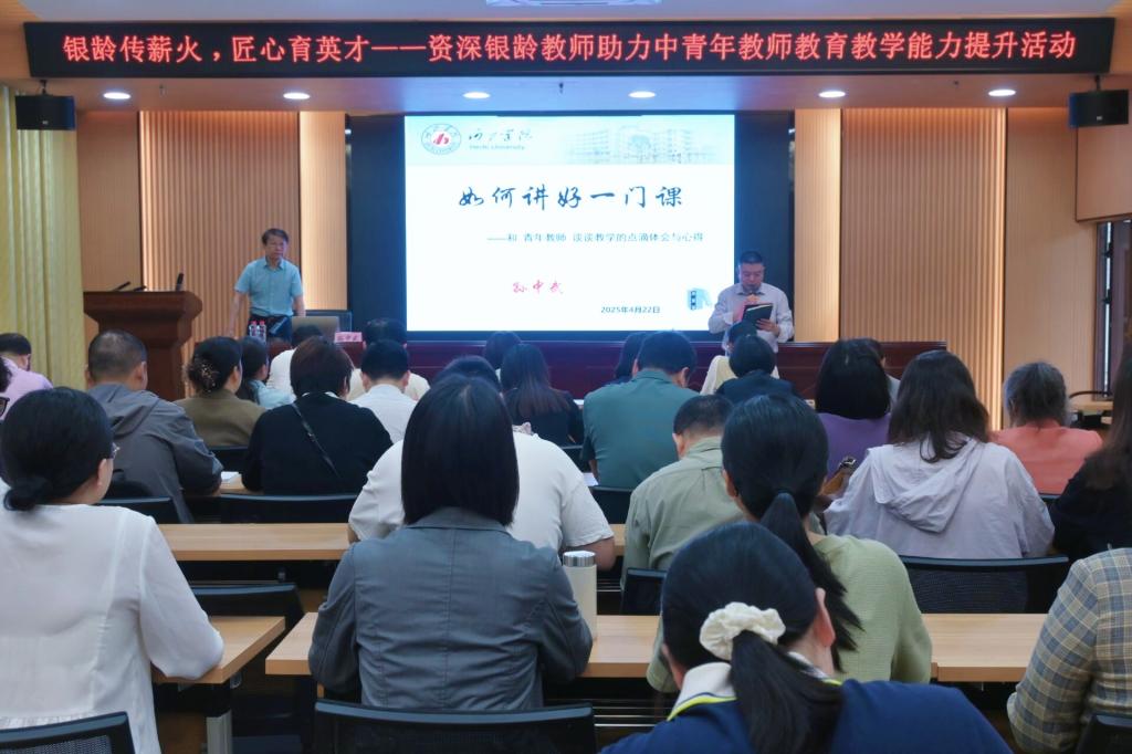 会上,银龄教师孙中武以“如何讲好一门课”为题作专题报告。他首先从师德师风层面强调“学高为师,身正为范”,指出“身正为先”是教师立身之本,认为教师要严肃工作纪律、规范工作作风、强化责任担当,真正做到“为党育人、为国育才”。在教学实践方面,孙中武提出“教无定法,教必有法,贵在得法”的教学原则,倡导“授人以鱼不如授人以渔”的教学理念。最后,孙中武还结合亲身经历,分享了教学经验和教学技巧。(作者:韦丽晶 拍摄:劳心妍、韦丽晶 校对:劳旻旻 审核:覃宝山)